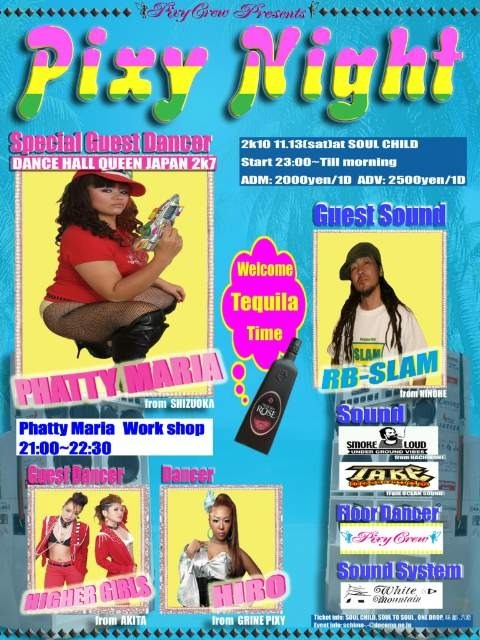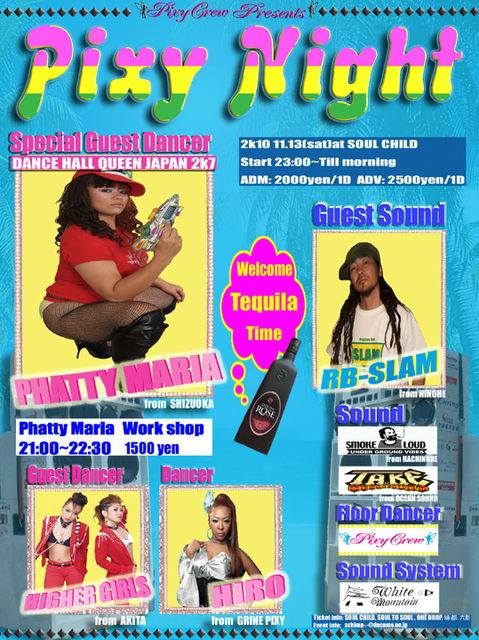 PIXY CREW PRESENTS PIXY NIGHT 2K10 11.13(SAT)@SOUL CHILD START 23:00〜Till morning ADM:2000yen/1D ADV:2500yen/1D SPECIAL GUEST DANCER DANCE HALL QUEEN JAPAN2K7 PHATTY MARIA Fr shizuoka GUEST DANCER HIGHER GIRLS Fr AKITA DANCER HIRO Fr GRINE PIXY GUEST SOUND RB-SLAM Fr NINOHE SOUND SMOKE LOUD Fr HACHINOHE TAKE Fr OCEAN SOUND FLOOR DANCER PIXY CREW SOUND SYSTEM BY WHITE MOUNTAIN PHATTY MARIAによるWORK SHOP開催