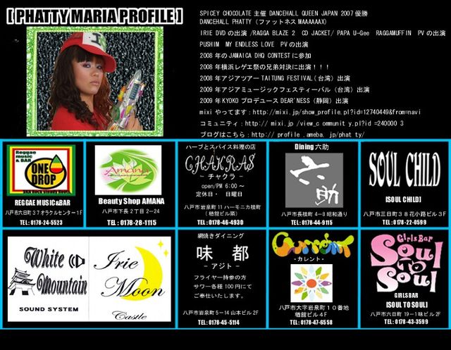 PIXY CREW PRESENTS PIXY NIGHT 2K10 11.13(SAT)八戸@SOUL CHILD START 23:00〜Till morning ADM:2000yen/1D ADV:2500yen/1D SPECIAL GUEST DANCERDANCEHALL QUEEN JAPAN2K7 PHATTY MARIA Fr shizuoka GUEST DANCER HIGHER GIRLS Fr AKITA DANCER HIRO Fr GRINE PIXY GUEST SOUND RB-SLAM Fr NINOHE SOUND SMOKE LOUD Fr HACHINOHE TAKE Fr OCEAN SOUND FLOOR DANCER PIXY CREW
