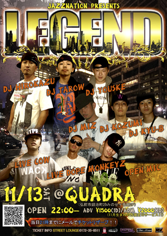 11/13(SAT)at QUADRA OPEN 22:00- ADV\1500(1Dr)/ADM\2000(1Dr) 11月生まれの方限定1Dサービス!! ★DJ★ HIROKAZU TAROW YOUSKE MIZ KOZUMI KYU-B ★LIVE★ COW DOPE MONKEYZ OPEN MIC... TICKET&INFO STREET LOUNGE0172-35-8511 メールでチケット予約!! 当日までに前売りチケット購入できない方必見!! イベント当日、夜9:00までにメールを送信していただくと、 前売り価格で入場することができます。 また、イベントの特典等のメールも受けとる事ができます。(希望者のみ) *やり方*