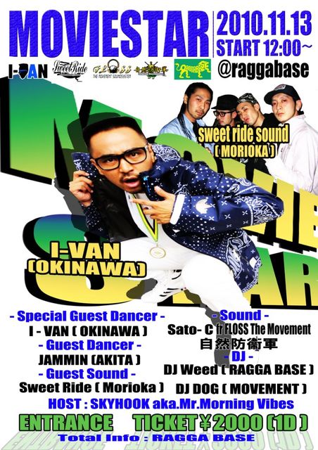 ★RAGGA BASE presents★ 『 MOVIE STAR 』 @RAGGA BASE ・2010/11/13(SAT) ・OPEN_START 24:00〜Till Morning ◆ENTRANCE◆ ・TICKET \2000(1D) ・DOOR \2000 -Special Guest Dancer- ・I-VAN(OKINAWA) -Guest Dancer- ・JAMMIN(AKITA) -Guest Sound- ・SWEET RIDE(MORIOKA CITY) -Sound- ・SATO-C fr.FLOSS THE MOVEMENT ・自然防衛軍 -DJ- ・DJ WEED(RAGGA BASE) ・DJ DOG(MOVEMENT) -Host- ・SKYHOOK aka.Mr.Morning Vibes ☆TOTAL INFO : RAGGA BASE ★プロフィール★ - I-VAN - 沖縄県出身。もは