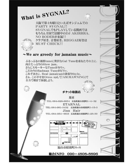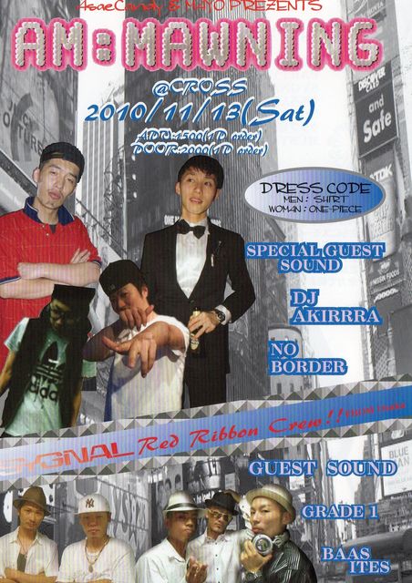 AsaeCandy&MAYO PREZENT REGGAE PARTY 大阪で第四水曜日に平日ながら間違いなく楽しめる音でクラブ好きから多大な人気を集めて注目されているBIG PARTY「SYGNAL」からREGGAEのメンバーがなんと福山にやってきちゃいます! AM:MAWNING @CROSS(福山) 2010/11/13(SAT) 22:00〜ALL NIGHT 【SPECIAL GUEST SOUND】 ☆RED RIBBON CREW!!!!☆ ♪DJ AKIRRRA (From Osaka) ♪NO BORDER (From Osaka) 【GUEST SOUND】 ♪GRADE1 ♪BAAS ITES 【EARLY SOUND】 ♪OG3 【DRE