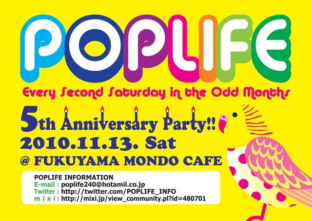 おかげさまで、POPLIFE5周年 スペシャル企画も準備中。 お見逃しなく POPLIFE - 5th Anniversary Party!! 2010年11年13日(土) 会場 : 福山 MONDO CAFE 広島県福山市南本庄町1-9-21 TEL:084-931-8655 http://mondocafe.web.fc2.com/ 時間 : 21:00 OPEN/START 〜 5:00-END DJ : JJ、240、Natsuko、Ari-chang NO CHANGE、入場無料、¥0 先着でセレクトをプレゼント MONDO CAFEコミュ