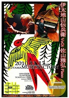佐山さんとのツアーの紹介です。 11/13(sat) open19:30start20:00 前¥2500当¥3000 1dr set 伊太地山伝兵衛(vo,gt) 佐山雅弘(pf) OA:MUSIC FACTORY SPECIAL BAND Sax 福本久記 Bass 前原 潔 Drum 岩本利之 Vocal REY 場所:福山ミュージックファクトリー 広島県福山市明神町2-8-2 電話:084-945-8481