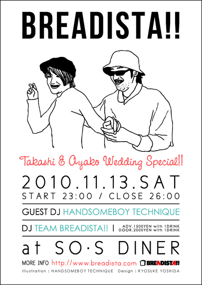 BREADISTA!! 〜 Takashi & Ayako WEDDING SPECIAL!! 〜 ◆GUEST DJ 森野義貴(HANDSOMEBOY TECHNIQUE) 2010.11.13(土) START 23:00 / CLOSE 26:00 @SO・S DINER 広島県福山市元町13-10 ILYA(イリヤ)ビル5F・6F TEL/084-924-1158 前売¥1500(1ドリンク付) / 当日¥2000(1ドリンク付) 来場者全員にHANDSOMEBOY TECHNIQUE選曲の スペシャル・セレクトCDをプレゼント!! フリー・フードあり! ※定数に達した場合、当日券は発行しない 可能性がございますので、予めご了承下さい。 ◆DJ TEAM BREADISTA!!