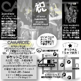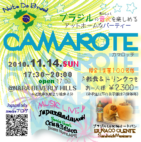 祝!Japaxelada10周年&Beverly Hills30周年 ブラジルの音食(おんしょく)を楽しめる アットホームなパーティー♪ 【CAMAROTE】 カマロッチ ■2010.11.14(sun) open 17:00 strat 17:30〜20:00 ■奈良ビバリーヒルズ (近鉄奈良駅から北へ徒歩2分) ■ブラジルフード&ドリンク付き お一人様 2300円 (中学生以下のお子様は入場無料) ※先着100名様限定です! ■Japaxelada ライブ★2ステージ ☆Special Guest☆ ブラジル人シンガー Cris maissato