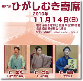 場所:奈良基督教会礼拝堂 時間:午後3時30分開演 料金:1200円 出番:出丸「はてなの茶碗」文華「たいこ腹」華紋「犬の目」 華紋くんは文華さんのお弟子さんです〜