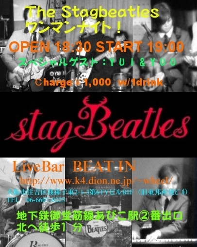 11月14日(日曜) 18:30〜オープン 19:00〜スタート LiveBar"BEAT IN"さんへ、是非、お越し下さいませ。 http://www.k4.dion.ne.jp/~wheel/schedule2010-11.html 大阪市住吉区我孫子東2-1-3(第6TYビルB1F) Tel.: 06-6607-0225 地下鉄「御堂筋線」あびこ駅?番出口 北へ徒歩1分 チャージ:Yen1,000(incl.1drink)