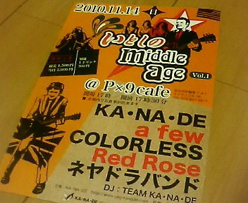 秋深まる今日この頃、皆様いかがお過ごしでしょうか。 来る11月14日にKA・NA・DEさん主催のライブ、 題して「いとしのMiddle Age」に参加させていただきます。 場所は樟葉P9カフェにて http://www.p9cafe.com/ 前売り1500円/当日2000円 出演は4バンド目です。 今回も多彩なバンドが盛りだくさんで楽しんで頂けると思いますので、 皆さんお誘い合わせのうえご来場をお待ちしております! よろしくお願いします。 オフィシャルWEBページはこちら! http://redrose.velvet.jp/