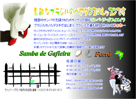 Oi Pessoal ! Tudo Bom ? ブラジルのペアダンスのレッスンをご案内させてください。 関西でも演奏活動されている個人やグループはたくさんありますが、 なぜか関西はず〜っとブラジルペアダンス不毛の地です。 ブラジル音楽はやっぱり踊れるとさらに楽しいことうけあいです。 基本的なことさえ覚えれば誰でもペアダンスは踊れます。 本場リオで師事した講師が丁寧にインストラクションします。 見学も歓迎です。 毎週日曜、大阪心斎橋のラテンバーアラモにて(大阪市東心斎橋1-13-33、3F) 16:00〜17:00 フォホー オールレベル