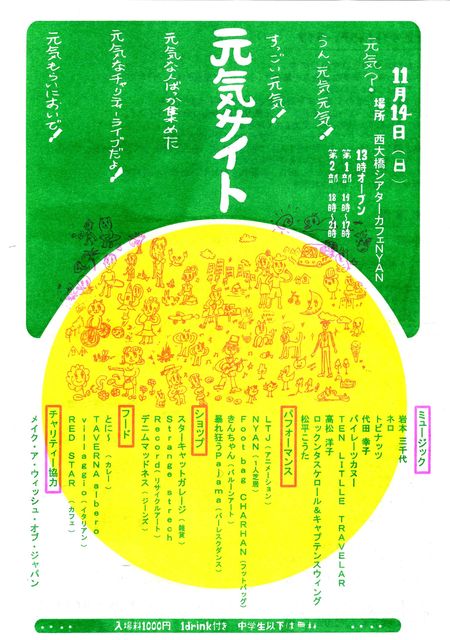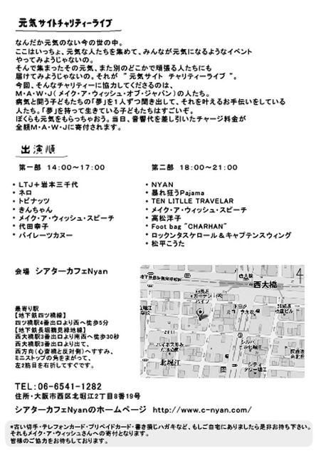 * 元気サイトチャリティーライブvol.2 * OPEN 13:00 第一部開始 14:00〜 第二部開始 18:00〜 会場 西大橋シアターカフェ Nyan http://www.c-nyan.com/#sixapart-standard 入場料 1000円(入場料500円+1ドリンク付き) ☆中学生以下無料 ※ 集まったお客さんたちの入場料から、音響代を差し引いた金額がメイク・ア・ウ ィッシュへ寄付されます。(イベント最後に寄付金額発表の予定) 〜ミュージシャン〜 ★岩本三千代 ★ネロ ★さちこ ★トビナッツ ★パイレーツカヌー ★TEN Little T