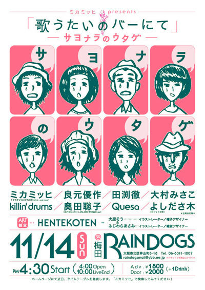 初めまして!(管理人ヒロさん、ずんこは、まぁまいどです〜) 大阪で弾き語りして6年ほどの、まだまだペーペー ミカミッヒ(元・三上和彦)と申します。 田渕徹とは、自分が音楽はじめる前からの付き合いですわ。 で、ミカミもですが、田渕も世話なってきるはずの名店 梅田RAINDOGSが年内で閉店につき最後にイベントをやろうと すぐさま田渕を誘いまして! あと田渕徹とは古い仲の、良元優作なんかも含め総勢8組に! 個性バラバラやけど、みんなホンマえぇ歌うたう素晴らしいアーティスト! さらに、イラストレーターユニット&写真