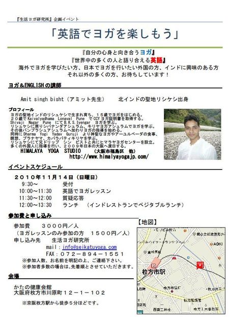 ★インドにヨガを学びに行こうと思っている皆様 ★英語のヨガレッスンを受けたい外国人の皆様、 ★インドに興味を持っている皆様、 ★その他、いろいろな皆様 インド・リシュケシュ出身のアミット先生をお招きして、 「英語DEヨガ」の特別クラスを開講します。 インドでのヨガ修行についての情報交換も行いましょう。 参加お待ちしています! ※現在、5名程度の空席です。 締め切り間近ですので、お早めにどうぞ! 〜〜〜〜〜〜〜〜〜〜〜〜〜〜〜〜〜〜〜〜〜〜〜〜 【スケジュール】 9:30 受付 10:00−11:30 英語でヨ
