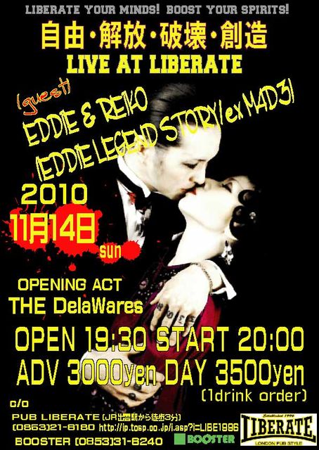 自由・解放。破壊・創造 guest EDDIE&REIKO(EDDIE LEGEND STORY/exMAD3) Opning ACT THE Delawares 2010・11.14(SUN) 場所 PUB LIBERATE OPEN 19:30 START 20:00 ADV \3000 DAY \3500 (1DRINK ORDER) 問い合わせ(前売りチケット有ります) PUB LIBERATE(0853)21−6180※20:00〜 BOOSTER (0853)31−6240※12:00〜 〜EDDIE LEGEND STORY〜 MAD3のギターヒーロー EDDIE LEGENDのソロバンド!新たなる伝説が始まる! 約20年もの