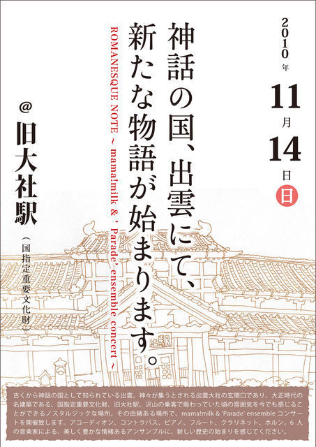 神話の国、出雲にて、新たな愛の物語が始まります。 ROMANESQUE NOTE 〜 mama!milk & 'Parade'ensemble concert 〜 ●2010年11月14日(日)@旧大社駅 (国指定重要文化財) 島根県出雲市大社町北荒木 開場:18時 / 開演:19時 前売り:3,000円 / 当日:3,500円 ※場所の詳細 http://www.arch-hiroshima.net/a-map/shimane/taisha-sta.html [神話の国の実行委員会] ・メールご予約・お問い合わせ fairway1102000@yahoo.co.jp ・電話ご予約・お問い合わせ 090-7999-3774 (伊藤) ・contrail farm http://www.contrailfarm.com/
