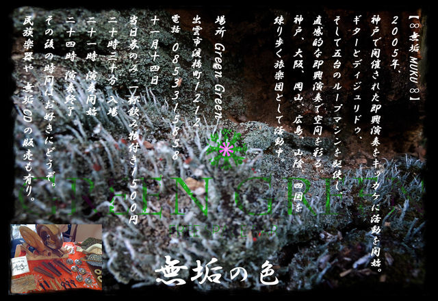管理人様、失礼します。 告知させて下さい。 【∞無垢MUKU∞】 2005年、神戸で開催された即興演奏をキッカケに活動を開始。ギターとディジュリドゥ、そして五台のループマシンを駆使し、直感的な即興演奏で空間を彩る。神戸、大阪、岡山、広島、山陰、四国を練り歩く旅楽団として活動中。 http://www.youtube.com/watch?v=88WnwYGMawc&feature=related メンバー ※1969年5月12日生まれ ギタリスト瀧康太… 幼少時、クラッシックピアノから音楽の道へ。パンクロックに衝撃を受け、ライブ、創作活動を開始。1999年にメジャーデビュー