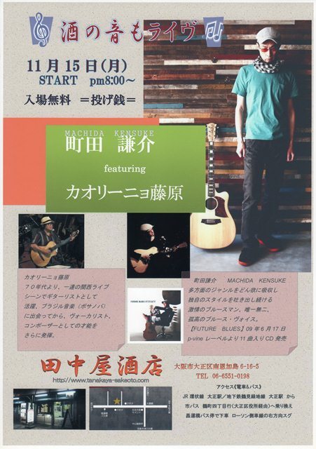 立ち呑み処田中屋酒店にて 『町田謙介』ライヴあります 大正区南恩加島(バス停/昌運橋スグ) ◆11月15日(月)入場無料(飲食代のみ) 【FUTURE BLUES夜】=投げ銭=(ライヴチャージ) ★町田謙介 ギターヴォーカル http://www.linkclub.or.jp/~machiken/ featuring★カオリーニョ藤原 ギターヴォーカル ※投げ銭…あなたが「よかった!」「楽しかったョ♪」と思って 頂いた分 よろしくお願い申し上げます。 ライヴインフォメーション http://music.geocit