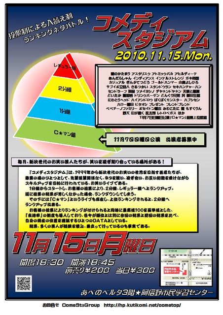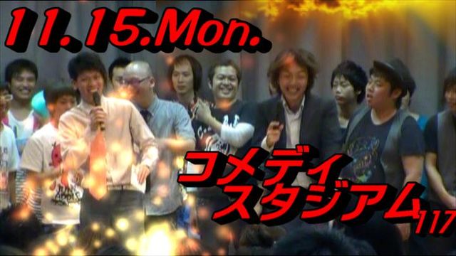 「第117回 コメディスタジアム」 http://hp.kutikomi.net/comedysta/ 2010年11月15日月曜日 開場18:30/開演18:45 あべのベルタ3階★阿倍野市民学習センター 大阪の総勢約40組の新人若手芸人集合。 「レギュラー組・2分組・1分組」の3段階層によるお客様による投票制の入れ替え戦お笑い熱きネタ、ランキングバトル。 MC/さるつかい&にわとりヘッド(OPのみダブルMC) 前説/ぱくぱくモンスター コーナーMC/レトロベガス mixiコミュニ