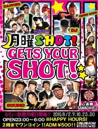 ※大阪で毎週月曜日の激アツのREGGAE PARTY! ”月曜SHOT!”〜GETS YOUR SHOT!〜 飲んで!踊って!わっしょい! フロアもBARも温度が上昇中です! しかもうれしい!2時まではなんと\500ポッキリ! ワンコイン入場のHAPPY HOURSが大人気です! かしこいPARTY好きは早め来場でお得にお遊び中! ドリンクのディスカウントTIMEがくれば BARは人だかり〜飲みまくり〜! だって毎週朝6時までNON STOP DANCE! 毎週替わりのサプライズ!なコンテンツをご用意! 今月はSNOBつねちゃん誕生会や 11/22祝前日にはなんと東京から猫ぢか