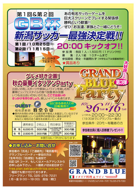 気軽にまずはお友達からスタートしましょう。 新潟駅南ドンキホーテ2階のグランブルーさんで第3回グランブルーパーティを開催します。 異性とお話する機会、場所がない。なにかきっかけがないと話すことができない。消極的だから自分からは話しかけることができない。どんなパーティなのか興味はあるけど・・・。 今回は楽しいゲームイベントや、相性診断士の先生もきてくれ、司会の方もすごく楽しい方。 グランブルーさんからはお料理の食べ放題と飲み放題が。 素敵なカクテルと一緒に美味しいお料理を一緒に堪能・・・! 最後は女性のだ