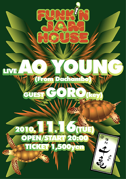 FUNK'N JAM HOUSE AO YOUNG (DACHAMBO) & GORO(MAJESTIC CIRCUS) LIVE @酒処 千亀 ■2010.11.16(TUE) ■OPEN/START 20:00 ■TICKET 1,500yen ■LIVE AO YOUNG(From Dachambo) http://www.myspace.com/420ao ■GUEST GORO(key) ■INFO 酒処 千亀 静岡県静岡市葵区伝馬町8-3 松崎ビル1階 TEL054-274-2829 http://www.hotpepper.jp/strJ000749025