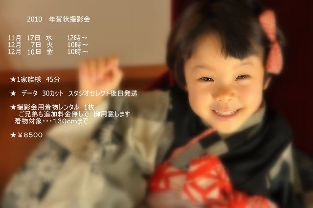 2010年 年賀状撮影会 お受付をスタートさせて頂きました。 皆さまの御参加お待ちしております^^ HPにて詳細を御案内しております〜 http://www.fujishiro-koubou.com お受付は mixi メッセージでもお受付します。 その際 御希望日 御希望御時間 お名前 御住所 お電話番号 お子様の性別 年齢をお知らせ下さい。 どうぞ宜しくお願い致します★