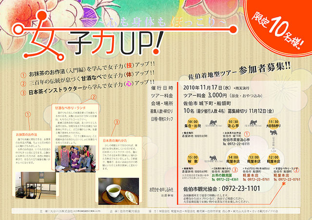 先着10名様 料金 3000円 寒くなってきたら温かいお茶が美味しいですよね^−^ 日本のお茶を2種類いただきます♪ お茶室で「お抹茶のいただきかた」日本茶インストラクターに「美味しい日本茶の淹れ方」を教えてもらいます。 ランチには身体があたたまり、美肌効果もある?!甘酒なべを作り、おやつの糀入りチョコブラウニーも作ります。 ちょっと欲張りなコースです。(今回は食べてばかりですw)是非ご参加ください!!! お問い合わせ・申し込み 佐伯市観光協会 0972-23-1101 sta7@peace.ocn.ne.jp HPで詳細を見るこ
