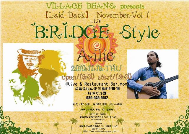 2010-11-18 (Thu) VILLAGE BEANS. presents 【Laid Back】Nobember.vol'1 2010.11.18.THU open/18:30 start/19:30 LIVE B:RIDGE style Ailie @ Live & Restaurant Bar. monk http://www.monk-matsuyama.com/ 愛媛県松山市三番町1−10−16相原ビル2F 089−945−9512 前売り¥2500 当日¥3000 ※入場時1ドリンク料金¥500が必要です。 チケット購入 / 予約 問い合わせ ※VILLAGE BEANS. 愛媛県松山市千舟町2−8−1三好ビル2F 089−935−81