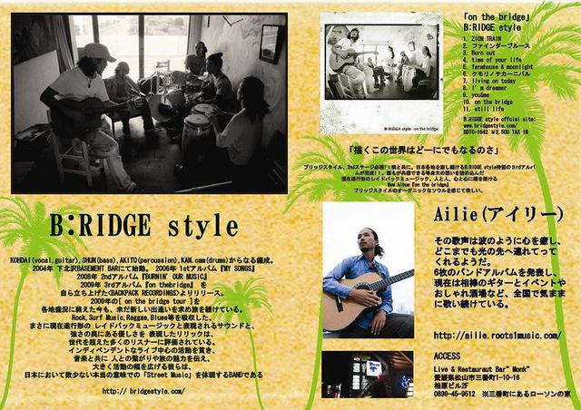 管理人様 ライブ告知失礼します。 愛媛松山にB:RIDGEstyle初上陸 今回はbrother「AILIE」も一緒に上陸します 愛媛の皆さん、要CHECKです よろしくおねがいします B:RIDGE style profile KOHDAI(vocal,guitar)、SHUN(bass)、 AKITO(percussion)、KAN.cam(drums)からなる編成。 2004年 下北沢BASEMENT BARにて始動。 2006年 1stアルバム『MY SONGS』 2008年 2ndアルバム『BURNIN' OUR MUSIC』 2009年 3rdアルバム『on the bridge』 を自ら立ち上げた<BACKPACK RECORDINGS>よりリリース。 2009年の[ on the bridge tour ]を各