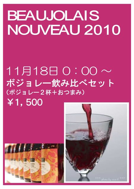 今年も来ました。 この時期が 2010.11.18.(木)0:00〜 いよいよ、『解禁』です。 ノスタ・ムでは、ワインと言う形で飲み比べを楽しんで貰うため、 毎年10数種類のヌーボーを揃えています。 ボジョレ地方だけでなく、ラングドック地方など他地方のヌーボーもご用意してます。 ぜひご賞味下さい。。 グラス¥800〜 多く飲み比べされたい方 Flee¥3800- (各種ドリンクもOKです) 他『ヌーボーおすすめ4杯』などのコースも用意してます。 ご相談下さい。