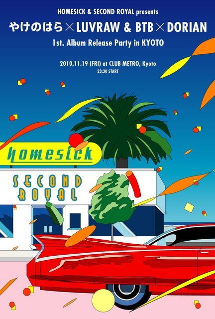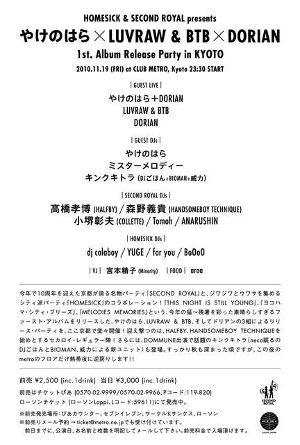 ◎今年で10周年を迎えた京都が誇る名物パーティ「SECOND ROYAL」と、ジワジワとウワサを集めるシティ派パーティ「HOMESICK」のコラボレーション!『THIS NIGHT IS STILL YOUNG』、『ヨコハマ・シティ・ブリーズ』、『MELODIES MEMORIES』という、今年の猛〜残暑を彩った素晴らしすぎるファースト・アルバムをリリースした、やけのはら、LUVRAW & BTB、そしてドリアンの3組によるリリース・パーティを、ここ京都で堂々開催!迎え撃つのは、HALFBY、HANDSOMEBOY TECHNIQUEを始めとするセカロイ・レギュラー陣!さらには、DO