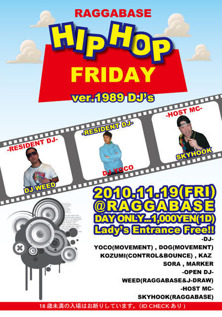 RAGGA BASE PRESENTS -HIP HOP FRIDAY- VER.1989 DJ's ■11/19(FRI) ■OPEN/22:00 ■DAY 1000YEN/1DRINK ■LADIES FREE! -1989 DJ's- YOCO(MOVEMENT) DOG(MOVEMENT) KOZUMI SORA KAZ(MAR会) MARKER(MAR会) -RESIDENT DJ- WEED -HOST MC- SKYHOOK ■TOTAL INFO RAGGA BASE -TIME TABLE- 22:00-22:50 WEED 22:50-23:40 MARKER 23:40-00:30 SORA 00:30-01:20 YOCO 01:20-02:10 KOZUMI 02:10-03:00 KAZ 03:00-03:50 DOG 03:50-04:30 WEED 04:30- RAGGA BASE TIME