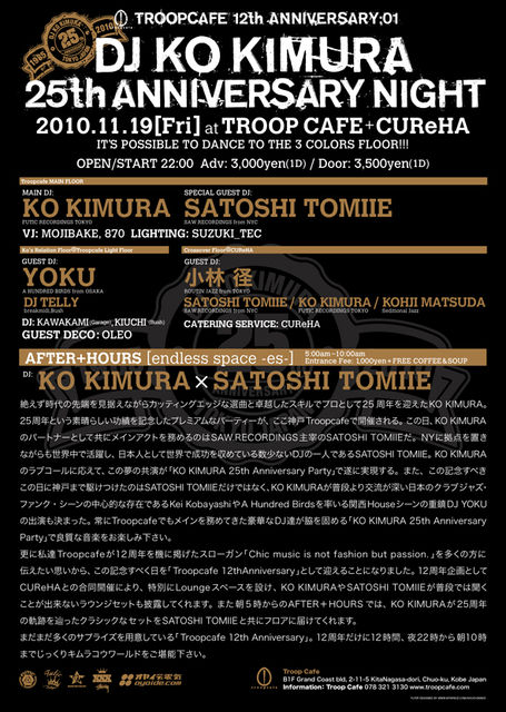 神戸Troopcafeが12周年を迎えます 1998年11月に異国文化漂う港町神戸に新しいクラブミュージック、カルチャー、ファッション、アートの発信基地として誕生したTroopCafeも12周年を迎えます。この12年間ご支援、ご協力してくださった方々、ご来店頂いた方々には改めて心より感謝申し上げます。 絶えず時代の先端を見据えながらカッティングエッジな選曲と卓越したスキルでプロとして25周年を迎えたKO KIMURA。25周年という素晴らしい功績を記念したプレミアムなパーティーが、ここ神戸Troopcafeで開催される。 この日、KO KIMURAのパー