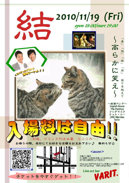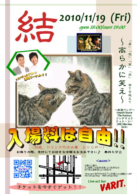藤崎マーケットの出演です♪ 11/19(Fri) 三宮 VARIT(http://www.varit.jp/)にて インディーズバンド「to-k1」(トキ)の主催イベント 「結〜高らかに笑え〜」にゲスト出演が決定!! open/18:00 start/19:00 入場料/自由 (入り口で封筒を受け取り、 帰りに封筒に好きな金額を入れてもらって回収。) ドリンク代/別途必要(1Drink→500円、飲み放題→2.000円) チケット/to-k1@star7.jpに空メールを送信するだけ!! 実は、 to-k1のVo.が藤崎マーケット・田崎君と 高校時代の同級生♪ そんな、繋