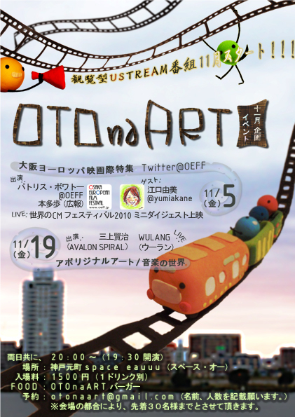 管理人様、告知失礼します! OTOnaART USTREAM番組第2弾!! アボリジナルアートと音楽特集!! 11/19(金)20:00~22:30 アボリジナルアート/音楽特集 出演:三上賢治(avalonspiral 、WULANG) avalonspiral詳細 ゲスト:FLYASH (OTOnaART) live:WULANG FOOD::OTOnaARTバーガー 観覧予約先着30名募集 予約:mail : otonaart@gmail.com Twitter : @OTOnaART(Dメールにて) (日時、名前、人数を記載願います。) 収録スタジオ 神戸元町space eauuu 料金:1500円(1ドリンク別) 番組の見方 OTOnaARTサイト http://otona