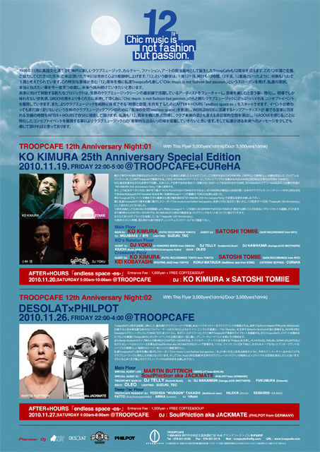神戸Troopcafeが12周年を迎えます 1998年11月に異国文化漂う港町神戸に新しいクラブミュージック、カルチャー、ファッション、アートの発信基地として誕生したTroopCafeも12周年を迎えます。この12年間ご支援、ご協力してくださった方々、ご来店頂いた方々には改めて心より感謝申し上げます。 絶えず時代の先端を見据えながらカッティングエッジな選曲と卓越したスキルでプロとして25周年を迎えたKO KIMURA。25周年という素晴らしい功績を記念したプレミアムなパーティーが、ここ神戸Troopcafeで開催される。 この日、KO KIMURAの