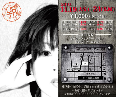謎だらけのGIGです ・19日 (金) /19:00 ・20日 (土) /19:00 ・21日 (日) /15:00 ・22日 (月) /19:00 ・23日 (祝火)/15:00 ・24日 (水) /19:00 入場料=\1,000- ※1ドリンク付きです