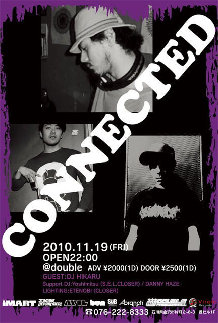 ++++CONNECTED++++ 2010/11/19(FRI) OPEN22:00 @DOUBLE ADV2000(1D) DOOR2500(1D) GUEST:DJHIKARU (MAIN FLOOR) Yoshimitsu(S.E.L.CLOSER) DANNY HAZE LIGHTING:ETENOBI(CLOSER) DJ HIKARU (ディジェー ヒカル) 現在もっともパーティの現場から厚く信頼され、日本中のおもしろパーティをトビ廻るDJ。ゆるい次男。ネコ好き。高円寺の人間交差点こと〈GRASSROOTS〉のハコ番。Dr.TETSUとのユニットBLAST HEADとしても活躍 していて、2007年6月20日に5年ぶりのアルバムをリリース。フリー・フォームを超