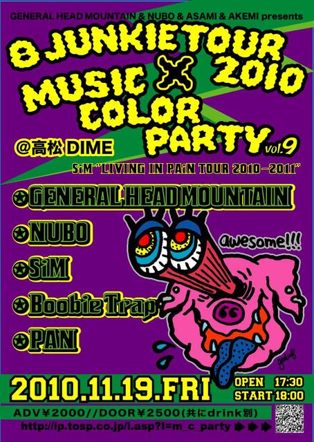 GENERAL HEAD MOUNTAIN&NUBO&ASAMI&AKEMI presents -8 JUNKIE TOUR 2010 x MUSIC COLOR PARTY vol.9- SiM "LIVING IN PAiN TOUR 2010-2011" 2010.11.19(金) @高松DIME ADV \2000/DOOR \2500(共にdrink別) OPEN 17:30/START 18:00 ・GENERAL HEAD MOUNTAIN ・NUBO ・SiM ・Boobie Trap ・PAN HP→http://ip.tosp.co.jp/i.asp?I=m_c_party プレイガイドでもチケット発売中 ☆d-ticket→17760 http://www.d-ticket.net/ ☆LAWSON→61885 http://l-tike.com/ なかなかナイ激アツなメンツ!! よろしくお願いします!!!