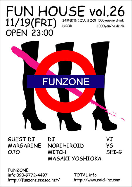 今回のFUN HOUSEは、メンバーが女の子だけで構成されているNICE partyのOTOJOより、 MARGARINEとOJOを迎えて行います。 可愛い女の子DJが紡ぎ出すgrooveをご堪能あれ。 ----------------------------------------------------------------------------------- ROID Inc. PRESENTS 『 FUN HOUSE vol.26』 2010.11.19(FRI) @FUNZONE START 23:00 24時までに入場される方 500yen/no drink DOOR 1000yen/no drink ----------------------------------------- -Guest DJ- MARGARINE OJO -DJ- NORIHIROID MITCH Mas