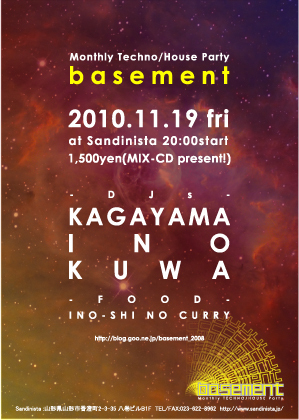 2010.11.19 fri @Sandinista 20:00start 1,500yen(MIX-CD present!) DJs: KAGAYAMA , INO , KUWA live: Coquettish Murder Girls FOOD:イノ氏のカレー レギュラー陣に加え、急遽Coquettish Murder Girlsのライヴが追加決定しました。 久しぶりの活動に本人達も燃えております! ぜひ皆様遊びにいらして下さい!