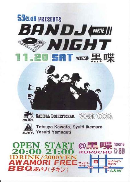 53 culb BANDJ partie NIGHT BAND BADICAL LOGHISTCKAR PINK SOUL DJEY Tatsuya Kawata Syuiti Ikemura Yasuiti Yamagati 2010.11.20 OPEN 20:00 START 21:00 1drink/2000yen 泡盛飲み放題 BBQあり(チキン) @黒喋 phone 73-3619