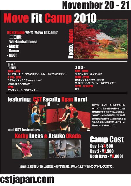 秋の京都で FIT CAMP 開催します。 Move Fit Camp 2010 提供:RCH Studio 2日間: -Workouts/fitness -Music -Dance -BBQ! ・日程:1日目 11AM – 4PM トップコーチ・ライアンのボディートレーニング入門セミナー 4PM – 6PM CSTインストラクター・キャシーのDanceFit入門セミナー 6PM- ダンスショー& BBQディナー ・日程:2日目 9AM – 10AM ライアンのモーニング•ヨガ 10AM – 12PM CSTインストラクター