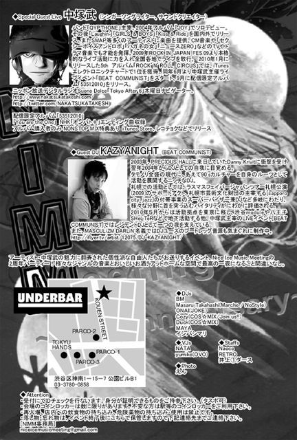 管理人様、貴重なスペースを少しだけお借りしてもよろしいでしょうか? ここ渋谷UNDERBARで開催させていただくイベントのお知らせです♪ アーティスト・中塚武の魅力にの虜となった個性派な自由人たちがお送りするイベント、 Nice Ice Music Meetingの2周年パーティー! House、Electro、Techno、Jazz、Pop、Rock・・・ 様々なジャンルの音楽で、DJ陣が空気を操り、 クリエイティブな映像、リアルタイムな映像でVJ陣が空間を彩り、 笑顔がはじける元気いっぱいなStaffが、アットホームな空間を作り、 その場にいるstaffとお客様の