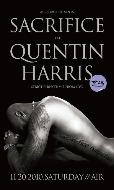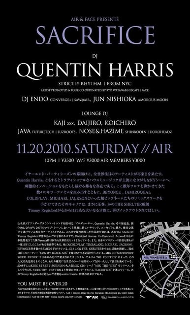 管理人様失礼します。 パーティーの告知をさせて頂きます。 2010.11.20(sat) AIR & FACE presents SACRIFICE feat. QUENTIN HARRIS @AIR start 10PM door: 3500yen | with flyer: 3000yen | AIR MEMBERS: 3000yen 全世界が注目する大いなる才能の持ち主"QUENTIN HARRIS"1年半ぶりにAIR登場。 イヤーエンド・パーティシーズンの幕開けに、全世界注目のアーティストが再来日を果たす。Quentin Harris。ともするとトラディショナルなハウスミュージックが主流になりがちなNYシーンへ、刺激的イノベーションをもたらし続ける稀有な存在であ