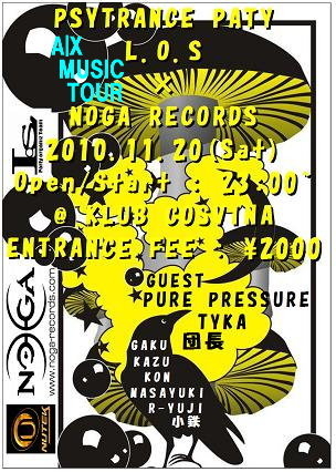 11.20(Sat) 福生COSVINA L.O.S×NOGA×ARMANI L.O.S PSYTRANCE Party×NOGA RECORDS A|X MUSIC TOUR NOGA RECORDS× Nutek Records× ARMANI EXCHANGE MUSIC TOUR PURE PRESSURE CD Release PARTY 11.20(Sat) Open/Start : 23:00~ @COSVINA(Tokyo/Fussa) ENTRANCE FEE : \2000 = GUEST DJ = TYKA(NOGA RECORDS/JP) 団長 (NOGA RECORDS/K-HOLE/JP) = DJ SET = GAKU (SILK RECORDS) KAZU (SIL KRECORDS) KON (SILK RECORDS) MASAYUKI (ZIEL) R-YUJI (L.O.S) = VJ = 小鉄 (REFLECT IMAGE)
