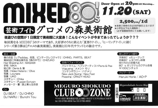 季節はもうすっかり秋ですね。 秋といえば皆様は何を連想しますか? 食欲の秋、芸術の秋・・・・・。 そんな秋にちなんで今回のMIXED80'Sは『芸術ナイト』を開催いたします。 サブタイトルは『グロメの森美術館』 一夜限りで目黒食堂が美術館に大変身しちゃいます。 絵画、写真等の展示だけではなくLIVEでアートの世界を体感できるコーナーも多数ご用意いたしまして皆様をお出迎えいたします。 展示作品と参加アーティスト 第86回二科展出展作品「森の中で」(CHIZUKO) Hair Bradi