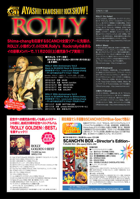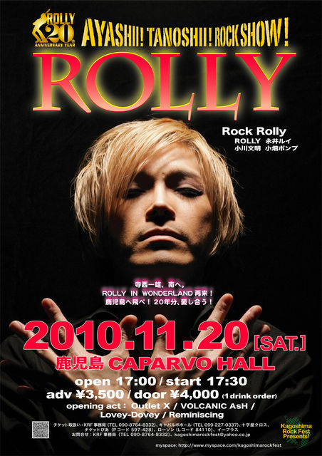 デビュー20周年を迎え、テレビ、舞台で大活躍のROLLYが、 昨年に続き再び鹿児島で、怪しくも楽しいロックショーを魅せる!! さらに今回はすかんちメンバーも参戦。 Shima-changを応援するSCANCH 全国ツアーに先駆け、 Rock Rolly・・・ROLLY、永井ルイ、小川文明、小畑ポンプの 豪華メンバーで、鹿児島ライブ決定!! お誘い合わせの上、皆様のご来場を心よりお待ちしております。 AYASHII!TANOSHII!ROCK SHOW! 2010年11月20日(土) 開場17:00 開演17:30 鹿児島