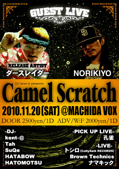 CAMEL SCRATCH @MACHIDA VOX http://www.westfleet.co.jp/ 2010/11/20(SAT) 23:00 OPEN(ALL NIGHT) DOOR 2500YEN/1D ADV 2000YEN/1D ※メッセージをいただければすぐにADV料金にディスカウント致します。 その際に、名前(ニックネームでも大丈夫です)と来場人数を明記して下さい。 HIP HOP/R&B/AND MORE PARTY MUSIC! ◆SPECIAL GUEST LIVE DARTHREIDER NORIKIYO(SD JUNKSTA) ◆PICK UP LIVE 孔雀 ◆LIVE トシロ Brown Technics ナマキック ◆DJ Kent-@ Tah SuQe HATOMOTSU HATABOW