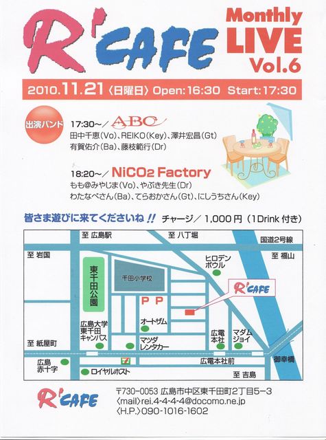 るんるん★R’CAFE☆monthly? LIVE11月21日 日曜日るんるん R'CAFE OPEN16:30〜   \1000 (1Drink付き) 17:30〜/【ABC】 田中千恵(Vo) REIKO(Key) 澤井宏昌(Gt) 有賀佑介(Ba) 藤枝範行(Dr) 18:20〜/【NICO2Factory】 もも@みやじま(Vo) やぶき先生(Dr) わたなべ(Ba) てらおかさん(Gt) にしうちさん(Key) ・・・・@・・・・@・・・・@・・・・ ぴかぴか(新しい)ぴかぴか(新しい)Fankyyyyyyyyyyyyyyyな時間を過ごしに来て下さいねぴかぴか(新しい)ぴかぴか(新しい) P 駐車場は ? AM8:
