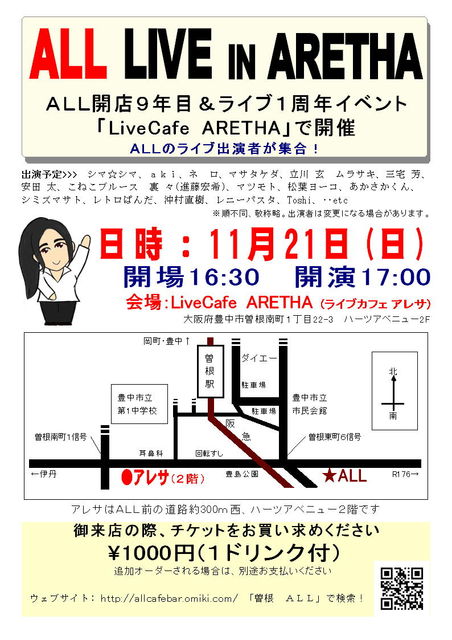 曽根東町6丁目にあるBar・ALLです。 開店9年目&ライブ1周年イベント [ALL LIVE in ARETHA]を開催します。 ALLのライブに出演されている方々が集まっての オールスターライブです! 日時 11月21日(日) 開場 16:30 開演 17:00 ※終了予定22:00 会 場:Live Cafe ARETHA(ライブカフェアレサ) 料 金:一人様:¥1000円(1ドリンク付) ※追加オーダーは別途。 アレサは、ALL店前道路を西へ約300mにあります。 素晴らしいライブカフェです! お気軽に